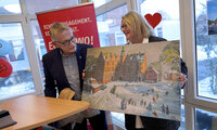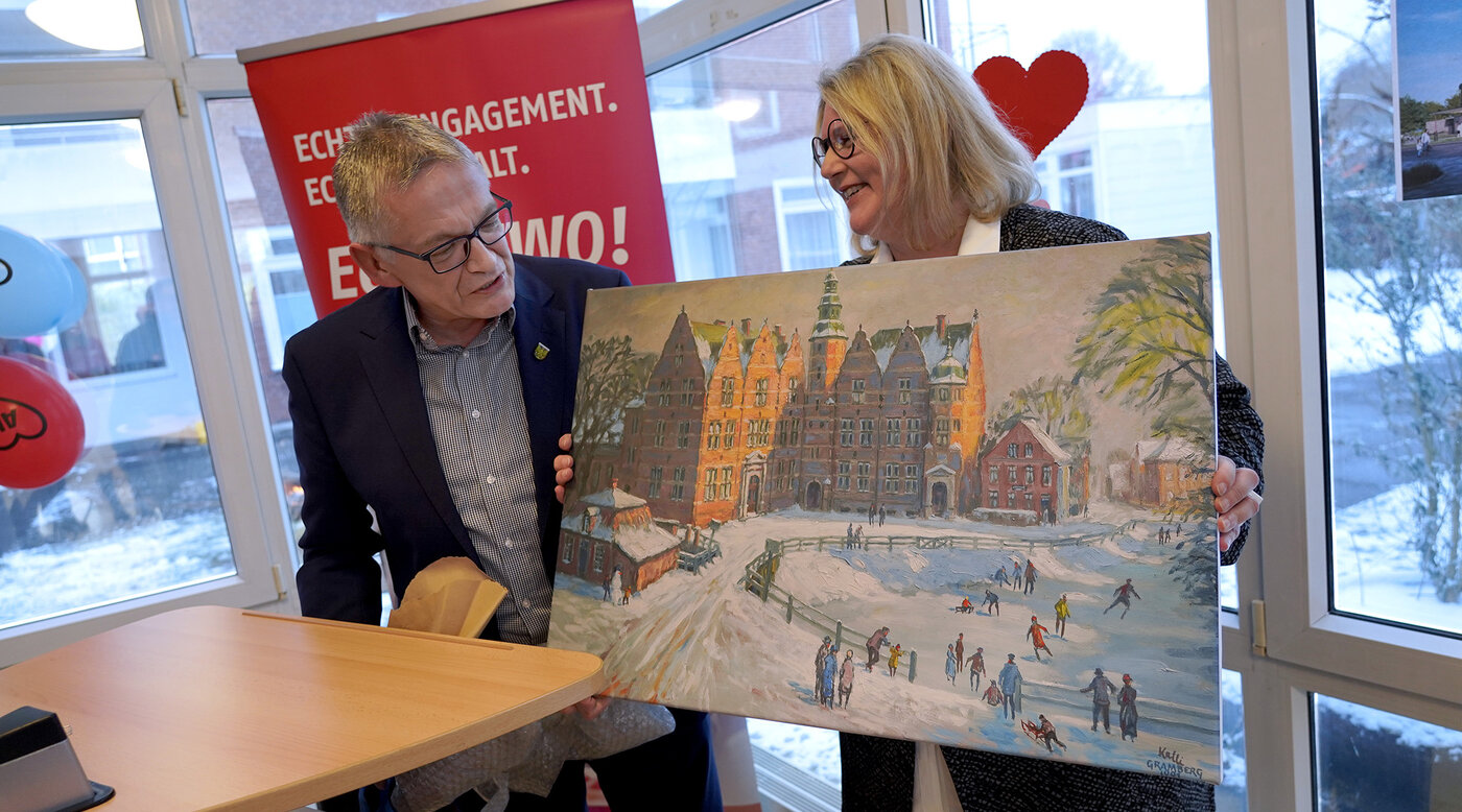 Geschenk: Landrat Olaf Meinen übergab Einrichtungsleiterin Susanne Ohlf ein besonderes Bild – es ist der erste „Deko-Artikel“ für die neue Einrichtung, die 2028 eröffnet werden soll.