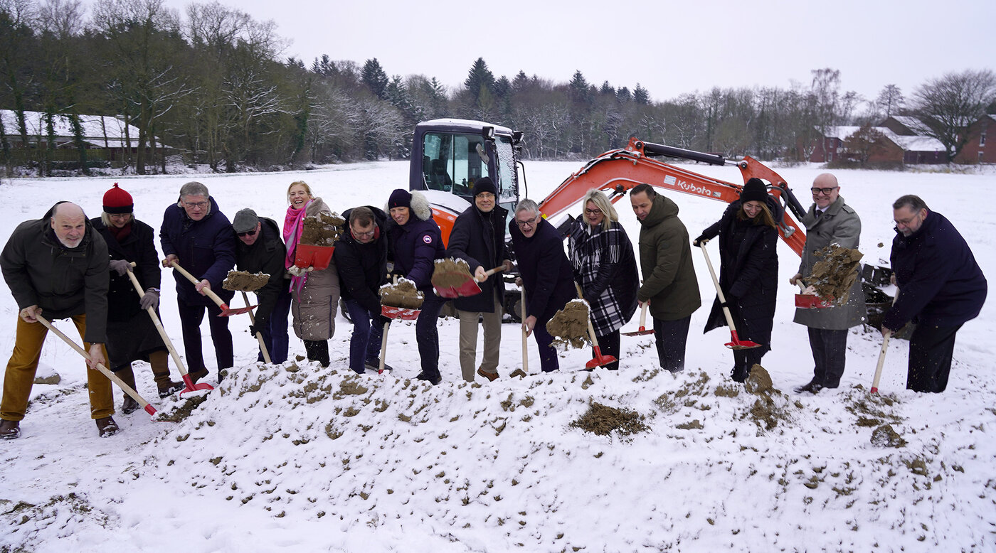 Spatenstich: Ob Schneeschieber oder Spaten – ganz egal: Gemeinsam machten die Projektbeteiligten bei diesem symbolischen Akt deutlich, dass sie hinter dem außergewöhnlichen Rundbau stehen.