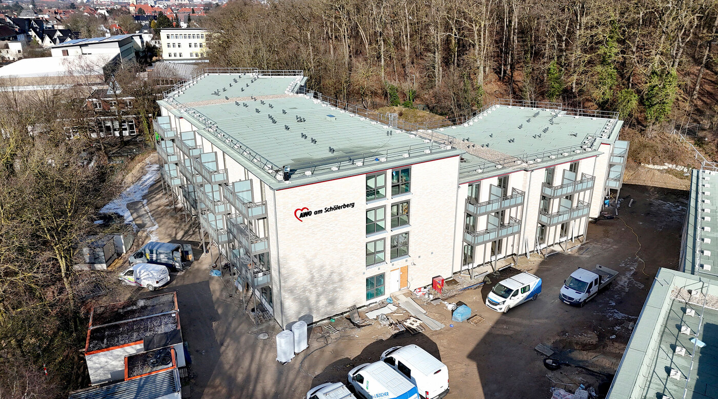 Auch wenn derzeit noch reichlich Matsch und Pfützen ringsum vor tieferen Einblicken ins Gebäude schützen, so zeigen aktuelle Luftbilder allemal, wie rasant sich die mehrgeschossige AWO-Einrichtung zur Eingliederungshilfe bislang entwickelt hat. Als vor rund drei Jahren das bis dato abgängige „Haus am Schölerberg“ an gleicher Stelle abgerissen und zum Übergang eine zweckmäßig hergerichtete Klinik in Georgsmarienhütte bezogen wurde, war die Vorfreude angesichts der bevorstehenden Wartezeit möglicherweise noch gedämpft. Nun aber, mit freiem Blick auf die tatsächlichen Ausmaße und die besondere Architektur der künftigen Anlage, wächst auch die Begeisterung bei allen Beteiligten.
