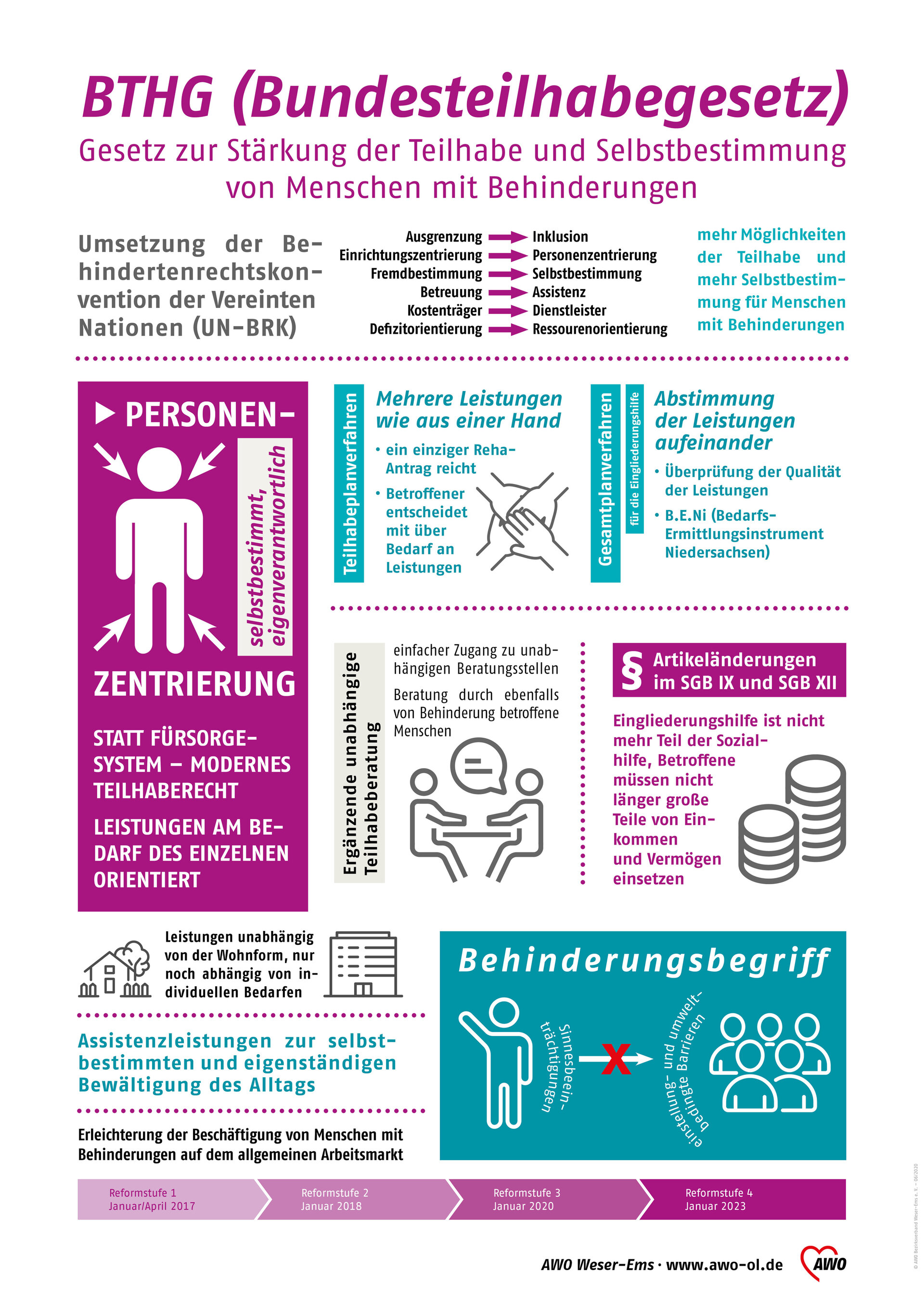 Konkret sollten die Selbstbestimmung ausgebaut und die Unterstützungsmöglichkeiten verbesserten werden sowie mehr Inklusion im Alltag erlangt werden. Unsere AWO Infografik zum Bundesteilhabegesetz bietet eine gute Übersicht.