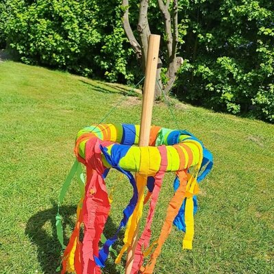 Am 30. April hat die Grüne Gruppe sich mit einem bunten Kranz und bunten Bändern auf den Weg gemacht und einen kleinen Maibaum auf dem Außengelände des Kindergartens aufgestellt. Mit dem bunt geschmückten Kranz begrüßen wir den Mai und freuen uns auf warme, sonnige Frühlingstage!