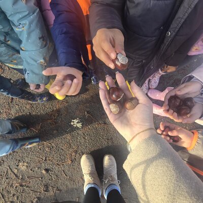 Aus den gesammelten Kastanien entstehen nun kreative Bastelarbeiten – erste Kastanienmännchen und kleine Rehe wurden bereits gestaltet.